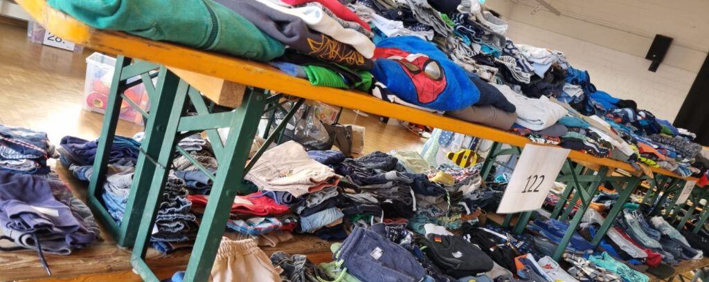 Am Tag vorher lieferten die Eltern, die eine der begehrten Verkäufernummern ergattert hatten, ihre Waren an und unsere „helfenden Hände“ sortierten sie unter Anleitung des Teams nach Größen und Sparten geordnet ein.